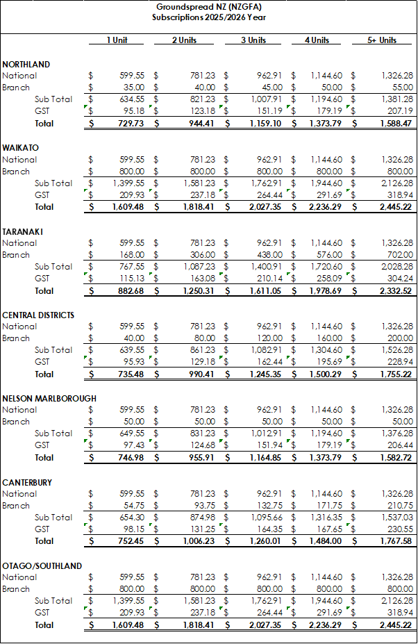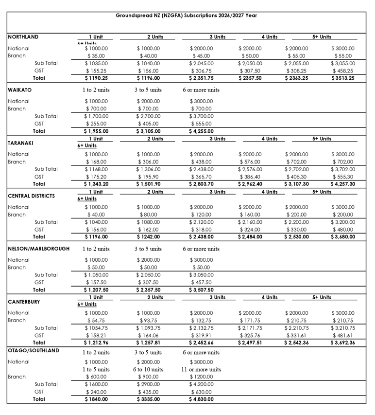 The cost of annual membership to Groundspread NZ is set by the national council. In addition to this fee, each regional branch will affix a levy to cover branch operating costs. Please note fees will vary according to the number of company spreading units.